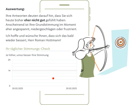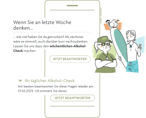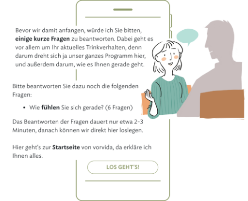 In einem interaktiven Dialog führen Sie virtuelle Gespräche mit vorvida. Basierend auf Ihren Antworten lernt das Programm Sie kennen und setzt individuelle Schwerpunkte. Dabei geht es um Themen wie Suchtdruck, Alkohol im Alltag und den Umgang mit Rückfällen.
